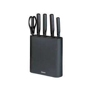 DIFERENCIAIS: o Conjunto de Facas 6 Peças c/ Cepo Action Brinox tem sua estrutura toda em aço inoxidável. A lâmina tem acabamento em preto e excelente afiação. O cabo na cor Preto é fabricado em ABS (polímero sobreinjetado especial) com acabamento soft-touch, é ergonômico e garante o manuseio confortável. Para deixar tudo a disposição, esse Jogo de Facas conta com suporte para as cincos peças, facilitando e agilizando na hora do preparo dos ingredientes e simplificando o seu dia a dia.