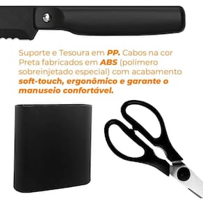 ESPECIFICAÇÕES TÉCNICAS: o Conjunto de Facas 6 Peças c/ Cepo Action Brinox é composto por: 1 Faca do Chef 8 polegadas 33 x 4 x 1,8 cm; 1 Faca para Pão 8 polegadas 33,5 x 3,2 x 1,8 cm; 1 Faca para Cozinha 8 polegadas 33,5 x 3,2 x 1,8 cm; 1 Faca para Legumes 3,5 polegadas 20,6 x 2,4 x 1,8 cm; 1 Tesoura 20,8 x 8,3 x 1,4 cm; e 1 Suporte - 23 x 7,8 x 22,8 cm. As lâminas das facas são em aço inoxidável e os cabos em ABS na cor Preto. O suporte, com acabamento soft-touch, e o cabo da tesoura são em polipropileno.