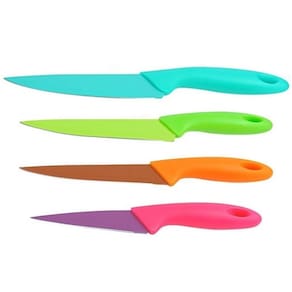 Lindo conjunto com 04 facas coloridas antiaderente Com lâminas em inox colorido e cabo anatômico. Leve e de fácil manuseio é o toque colorido que faltava na sua cozinha