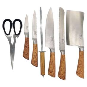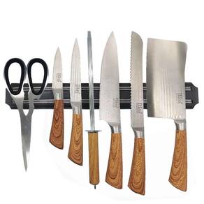 Facas afiadas de cozinha proporcionam rapidez e qualidade nas tarefas culinárias. Kit com 8 peças, sendo 5 facas antiaderentes, Chaira amolador ou afiador e um suporte magnético, 1 tesoura.