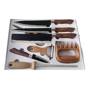 Kit com 8 pecas, sendo: 1 - Garra de urso 1 - Descascador 1 - Tesoura 1 - Chaira 1 - Cutelo de Carne 8'' 1 - Faca de Chef de 8'' 1 - Faca de Corte de 8'' 1 - Faca de Descascar de 3,5''