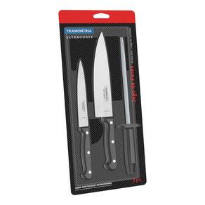 Jogo de Facas com Chaira Tramontina Ultracorte com Lâminas em Aço Inox e Cabos de Polipropileno Preto 3 Peças O Jogo de Facas com Chaira Tramontina Ultracorte com Lâminas em Aço Inox e Cabos de Polipropileno Preto 3 Peças da Linha Ultracorte é perfeito tanto as receitas diárias quanto para os momentos em família aos domingos. O conjunto de 3 peças é ideal para corte e manter o fio das facas. As lâminas das facas são de aço inox e possuem tratamento térmico que dão maior durabilidade ao fio. Os cabos são de polipropileno com proteção antibacteriana, que inibem o crescimento de fungos e bactérias. A chaira é produzida de aço revestido de cromo duro. São produtos de qualidade essenciais para o preparo de suas receitas. Fáceis de limpar e confortáveis no uso, podem ser levados à máquina de lavar louças.