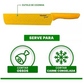 DESCRIÇÃO: Jogo de Facas Premium 6 peças1 - Faca de chef 20,3 cm1 - Faca para Pão 20,3 cm1 - Cutelo de Cozinha 20,3 cm1 - Faca para Legumes 15,3 cm1 - Descascador1 - Tesoura Multiuso Facas: Com Cabo em Plástico de alta qualidade, com lâmina em Aço Inoxidável na cor Amarelo Marca: Titanium do Brasil.
