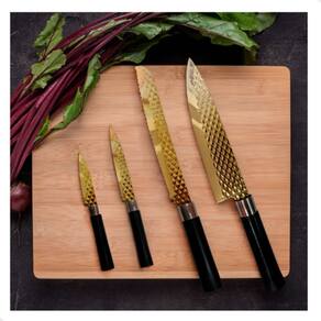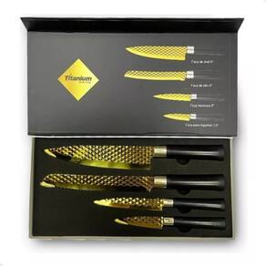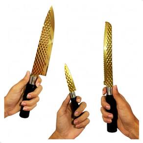 O Conjunto de Facas Premium acompanha 4 Peças incluindo 4 facas. Fabricadas em aço inox com revestimento antiaderente e cabo ergonomico soft touch com acabamento emborrachado que possui maciez, suavidade, conforto e segurança. Possui Lâmina com tratamento térmico total que proporciona maior rigidez, resistência, durabilidade do fio facilidade de afiação.