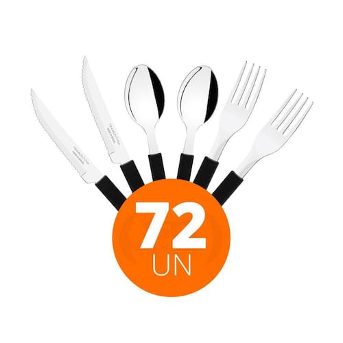 COMPONENTES DO KIT: - 24 Faca para Churrasco Leme com Lâmina em Aço Inox e Cabo de Polipropileno Preto 4- Tramontina 23180404 - 24 Garfo de Mesa Leme com Lâmina em Aço Inox e Cabo de Polipropileno Preto - Tramontina 23182400 - 24 Colher de Sopa Leme com Lâmina em Aço Inox e Cabo de Polipropileno Preto - Tramontina 23183400