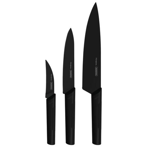 Jogo Conjunto de Facas 3 Peças Nygma Tramontina Inox Sublimação Preta O mais novo lançamento Tramontina traz muita elegância e diferencial para sua cozinha. A linha Nygma foi desenvolvida especialmente para dar mais prazer a arte do preparo de alimentos. A textura e o design do cabo, conciliam a lâmina de aço inox com sublimação preto. - Lâminas em aço inox com sublimação em preto - Maior durabilidade do fio devido ao tratamento térmico - Maior capacidade de deslize reduzindo esforço durante o corte - Cabos de polipropileno com textura especial - Material atóxico com proteção antimicrobiana - Inibe o crescimento de fungos e bactérias Lave suas facas usando uma esponja macia, sabão ou detergente neutro. Para maior durabilidade da cor da lâmina, não recomendamos levar a máquinas de lavar. Conteúdo da embalagem: 01 Faca chef 8" 01 Faca utility 6" 01 Faca para tornear 3" Peso: 0,3500 Kg. Medidas da embalagem: 38,5x 18x 3,3 cm. Ean: 7891112279094