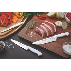 As facas da Linha Premium têm design moderno e o cabo anatômico de polipropileno é texturizado, oferecendo conforto e segurança durante o manuseio. O corte dos alimentos é facilitado pelo fio de alta durabilidade devido ao tratamento térmico aplicado nas lâminas de aço inox. A linha dispõe de formatos especiais a diferentes usos. Para maior praticidade, utilize sempre a faca adequada. Podem ser levadas à máquina de lavar louças.
