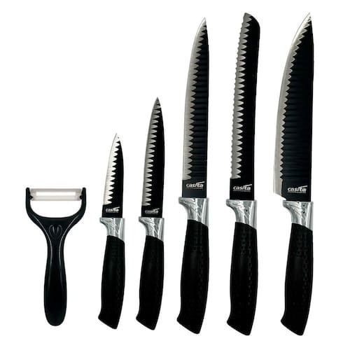 Seu material de Inox e Polimero trará facilidade ao corte, desde os legumes do almoço, até aquele churrasco de domingo com a família. Contendo 6 peças, este kit conta com faca do chef, faca de pão, duas facas santoku de tamanhos diferentes, uma faca de frutas e um descascador.