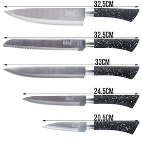 01 - Faca de legumes Comprimento: 20 cm Comprimento só da lamina: 9cm Espessura; 1,2mm Material Lamina : Aço Inox ----------------------------------------- 01 - Faca para Trinchar Comprimento: 24 cm Comprimento só da lamina: 13 cm Espessura; 1,2mm Material Lamina : Aço Inox ------------------------------------------ 01 - Faca do chef Comprimento: 33 cm Comprimento só da lamina: 20 cm Espessura; 1,2mm Material Lamina : Aço Inox ------------------------------------------- 01 - Faca para Pão Comprimento: 33 cm Comprimento só da lamina: 20 cm Espessura; 1,2mm Material Lamina : Aço Inox -------------------------------------------- 01 - Faca para File Comprimento: 33,5 cm Comprimento só da lamina: 20,5 cm Espessura: 1,5mm Material Lamina: Aço Inox --------------------------------------------- 01 - Suporte Altura: 22cm Largura: 10,1 cm Comprimento: 16,2 cm