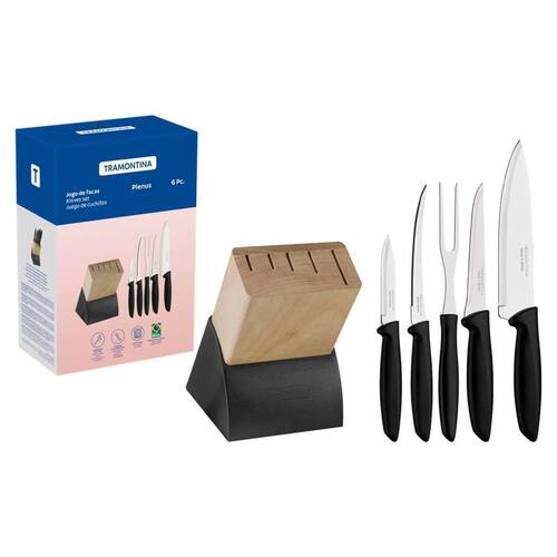 - Você vai impressionar seus convidados com o jogo de facas Tramontina Plenus com lâminas em aço inox cabos de polipropileno preto e suporte de madeira 6 peças da linha Plenus. São cinco peças produzidas com cabos na cor preta de polipropileno e lâminas de aço inox, resistentes e fáceis de manusear, podendo ser levadas à máquina de lavar louças. Versáteis e com design moderno, se encaixam em diferentes usos. Podem serem usadas desde preparações mais simples até mais elaboradas. O jogo de facas é a escolha ideal para embelezar ainda mais o seu ambiente!