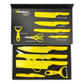 Jogo de Facas Premium Aço Inoxidável Chef Titanium Gourmet Amarelo 6 Peças
