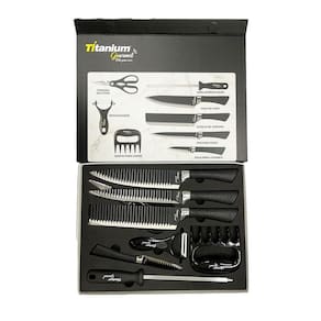 01 faca de chef 01 faca multiuso 01 faca para legumes 01 cutelo 01 amolador/afiador 01 tesoura multiuso 01 descascador 01 garfo para carne