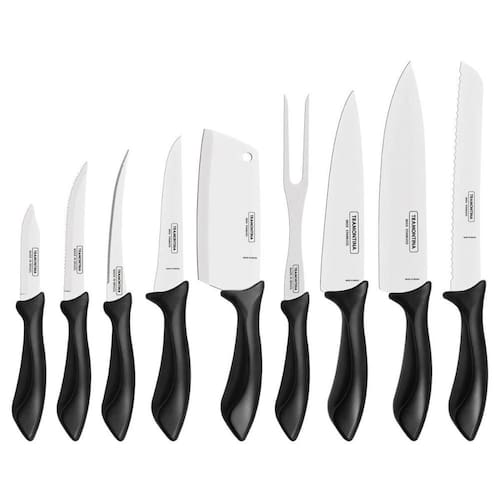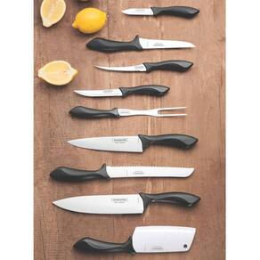 Conteúdo: 1 faca para legumes e frutas, 1 faca para churrasco, 1 faca para pão, 1 faca para dessosar, 1 faca chef, 1 faca utility, 1 faca para tomate, 1 cutelo e 1 garfo trinchante;