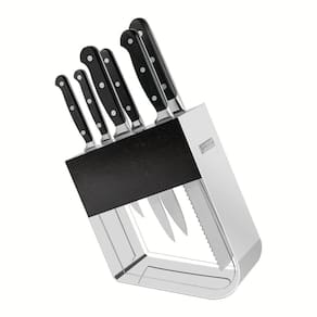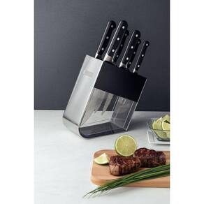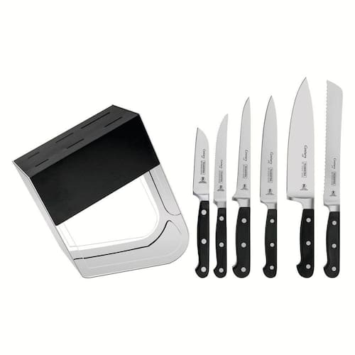 A rotina na cozinha fica ainda mais prática quando contamos com facas de alta qualidade. Com o Jogo de Facas Tramontina Century com Lâminas em Aço Inox e Cabos de Policarbonato e Fibra de Vidro com Suporte 7 Peças da linha Century você terá as melhores facas ao seu alcance. As faças são produzidas com lâminas de aço inox de altíssima qualidade que, aliada ao eficiente com tratamento térmico diferenciado, composto por têmpera, sub-zero e revenimento, além de dureza de 55 e 58 HRc, lhe garantem vida longa e eficiente. Para tornar o manuseio confortável e seguro, as facas contam com cabo anatômico e ergonômico em policarbonato com fibra de vidro. Acompanha suporte de acrílico com aço inox, para fazer bonito na sua bancada. Orientações As lâminas forjadas de aço inox especial garantem um fio com maior durabilidade e precisão. As lâminas possuem tratamento térmico diferenciado, composto por têmpera, sub-zero e revenimento. E contam com dureza da lâmina de 55 e 58 HRC, que garante maior resistência do fio e precisão no corte. Os cabos de policarbonatos reforçado com fibra de vidro garante alta durabilidade, equilíbrio e segurança. Os cabos ergonômicos proporcionam maior segurança, equilíbrio e conforto na hora do corte. Suporte de acrílico com aço inox que oferece uma proteção as peças. Podem ir à máquina de lavar louças facilitando seu dia a dia. Características Gerais EAN13 7891112070516 DUN14 17891112070513 NCM 8211.10.00 Peso Líquido 2,3700 kg. Peso Bruto 2,8250 kg. Metragem 0,008508 m³. Dimensões Embalagem (Compr. X Larg. X Alt.) 222x 105x 365 mm. Cor 1 000000 Hexa Observações Antes da primeira utilização, lave bem as peças e seque-as.Produtos cortantes e perfurantes: tenha cuidado ao manusear e mantenha fora do alcance das crianças.Para maior durabilidade dos produtos recomenda-se secar bem antes de guardar, mesmo após lavagem em máquina. Recomenda-se o uso de tábuas de polipropileno ou madeira da Tramontina para maior durabilidade do fio das facas. Não é indicado o uso das facas para o corte de alimentos congelados. Mantenha sempre suas facas afiadas utilizando os afiadores da Tramontina.Para descarte dos produtos e embalagens siga as orientações de reciclagem vigentes.