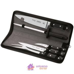 Jogo de Facas Tramontina Century com Lâminas em Aço Inox e Cabos de Policarbonato e Fibra de Vidro com Estojo 6 Peças Os melhores momentos na cozinha em casa, surgem quando oferecemos o melhor para as pessoas que a gente gosta. Para isso, é essencial contarmos com itens de qualidade. Você vai ter muita praticidade a partir de agora com o Jogo de Facas Tramontina Century com Lâminas em Aço Inox e Cabos de Policarbonato e Fibra de Vidro com Estojo 6 Peças, da linha Century. O jogo vem em um belíssimo estojo sintético e conta com facas com lâminas de aço inox forjadas de altíssima qualidade que, aliada ao eficiente com tratamento térmico diferenciado, composto por têmpera, sub-zero e revenimento, além de dureza de 55 e 58 HR e cabos de policarbonato com fibra de vidro, garfo trinchante com lâmina de aço inox e cabo de polipropileno e chaira com haste de aço carbono cromado e cabo de polipropileno. Ou seja, tudo que você pode precisar para realizar as melhores receitas e conseguir um sabor inesquecível para os momentos especiais em casa. Informações Gerais As lâminas forjadas de aço inox especial garantem um fio com maior durabilidade e precisão. As lâminas possuem tratamento térmico diferenciado, composto por têmpera, sub-zero e revenimento. E contam com dureza da lâmina de 55 e 58 HRC, que garante maior resistência do fio e precisão no corte. Os cabos de policarbonato reforçado com fibra de vidro garante alta durabilidade, equilíbrio e segurança. Garfo trinchante com lâmina de aço inox e cabo de polipropileno. Chaira com haste de aço inox especial garante um com maior durabilidade, precisão para a afiação e cabo de polipropileno garante alta durabilidade, equilíbrio e segurança. O cabo ergonômico proporciona maior segurança, equilíbrio e conforto. Estojo sintético que oferece uma proteção as peças, permitindo o transporte e armazenagem com maior segurança. Podem ir à máquina de lavar louças facilitando seu dia a dia. Recomendações de Uso Antes da primeira utilização, lave bem as peças e seque-as. Produtos cortantes e perfurantes: tenha cuidado ao manusear e mantenha fora do alcance das crianças. Para maior durabilidade dos produtos recomenda-se secar bem antes de guardar, mesmo após lavagem em máquina. Recomenda-se o uso de tábuas de polipropileno ou madeira da Tramontina para maior durabilidade do fio das facas. Não é indicado o uso das facas para o corte de alimentos congelados. Mantenha sempre suas facas afiadas utilizando os afiadores da Tramontina. Para descarte dos produtos e embalagens siga as orientações de reciclagem vigentes.
