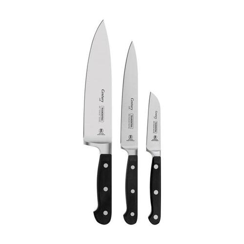 Jogo de Facas Tramontina Century com Lâminas em Aço Inox e Cabos de Policarbonato e Fibra de Vidro 3 Peças As lâminas forjadas de aço inox especial garantem um fio com maior durabilidade e precisão. As lâminas possuem tratamento térmico diferenciado, composto por têmpera, sub-zero e revenimento. E contam com dureza da lâmina de 55 e 58 HRC, que garante maior resistência do fio e precisão no corte. Os cabos de policarbonatos reforçado com fibra de vidro garante alta durabilidade, equilíbrio e segurança. Os cabos ergonômicos proporcionam maior segurança, equilíbrio e conforto na hora do corte. Podem ir à máquina de lavar louças facilitando seu dia a dia. Recomendações de uso Antes da primeira utilização, lave bem as peças e seque-as.Produtos cortantes e perfurantes: tenha cuidado ao manusear e mantenha fora do alcance das crianças.Para maior durabilidade dos produtos recomenda-se secar bem antes de guardar, mesmo após lavagem em máquina. Recomenda-se o uso de tábuas de polipropileno ou madeira da Tramontina para maior durabilidade do fio das facas. Não é indicado o uso das facas para o corte de alimentos congelados. Mantenha sempre suas facas afiadas utilizando os afiadores da Tramontina.Para descarte dos produtos e embalagens siga as orientações de reciclagem vigentes.