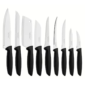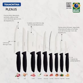 Com o jogo de facas Tramontina Plenus com lâminas em aço inox e cabos de polipropileno preto 9 peças, você terá a solução completa de facas para utilizar nos mais diversos tipos de cortes e ocasiões gastronômicas. As peças combinam com qualquer cozinha e a deixam mais bonita e clássica, pois seus cabos são na elegante cor preta. As lâminas produzidas em aço inox por terem sido submetidas a tratamento térmico, oferecem maior durabilidade e resistência. Elas são fáceis de limpar e podem ser lavadas na máquina de lavar louças. Com peças únicas e de muita importância na cozinha, o jogo de facas é a escolha perfeita para você. Facas de qualidade e beleza você encontra com a Tramontina!