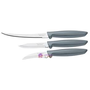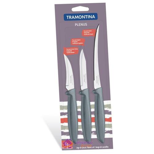 Jogo de Facas Tramontina Plenus com Lâminas em Aço Inox e Cabos de Polipropileno Cinza 3 Peças Suas receitas vão ficar muito mais saborosas e fáceis de fazer com o Jogo de Facas Tramontina Plenus com Lâminas em Aço Inox e Cabos de Polipropileno Cinza 3 Peças da Linha Plenus. Com três peças projetados para cortar, descascar e tornear legumes, verduras e frutas, são peças que atendem a diferentes usos. Vão desde o café da manhã até o jantar e reuniões com amigos. São produzidos com materiais de qualidade, os cabos em polipropileno na cor cinza são fácil de manusear e as lâminas em aço inox são resistentes. Podem ser utilizados na máquina de lavar louças.