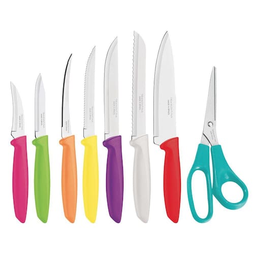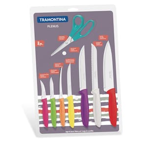 Jogo de Facas Tramontina Plenus com Lâminas em Aço Inox e Cabos de Polipropileno Colorido 8 Peças Para deixar as tarefas do dia-a-dia ainda mais animadas, o Jogo de Facas Tramontina Plenus com Lâminas em Aço Inox e Cabos de Polipropileno Colorido 8 Peças da Linha Plenus é a escolha perfeita. Com oito peças, possui cabo de polipropileno em diferentes cores, muito confortável para o manuseio. As lâminas são resistentes e produzidas em aço inox. O visual moderno e divertido dos utensílios fazem deles escolhas versáteis para diferentes usos. Do café da manhã ao jantar, o churrasco com os amigos e as reuniões em família, eles se encaixam perfeitamente. Podem ir à máquina de lavar louças. Informações Gerais As lâminas de aço inox tem maior durabilidade do fio devido ao tratamento térmico. Os cabos de polipropileno possuem maior resistência e durabilidade. Podem ir à máquina de lavar louças facilitando seu dia a dia.