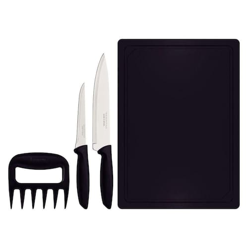 O jogo de facas Tramontina Plenus com lâminas em aço inox cabos de polipropileno preto e tábua para cortar 4 peças é essencial para qualquer cozinha. O jogo contém 2 facas, uma garra multiuso e uma tábua que atendem diferentes usos e necessidades: do preparo dos alimentos ao serviço de mesa. Ideal para cortar carnes e legumes, acompanha tábua de corte em polipropileno na cor preta. As lâminas em aço inox são resistente. Fáceis de limpar, podem ser levadas à máquina de lavar louças.