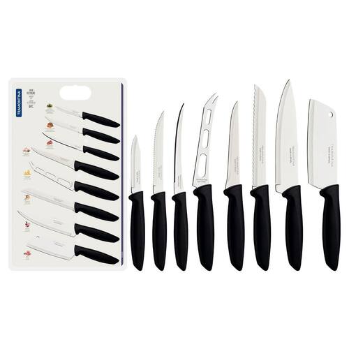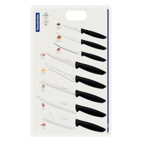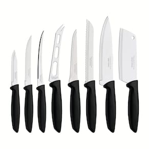 Com o Jogo de Facas Tramontina Plenus com Lâminas em Aço Inox e Cabos de Polipropileno Preto 8 Peças da Linha Plenus você vai possuir itens essenciais para as mais variados tipos de preparos. Perfeitas para diferentes usos, vão do preparo dos alimentos ao serviço de mesa. Produzidas com cabos na cor preto em polipropileno e lâminas em aço inox, são de fácil manuseio e resistentes, podendo ser levadas à máquina de lavar louças. As oito peças possuem design moderno que atestam versatilidade. São a escolha perfeita para a sua cozinha.