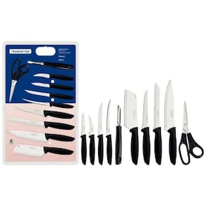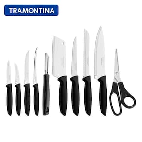 Sua cozinha ganhará maior funcionalidade e versatilidade com o jogo de facas Tramontina Plenus com lâminas em aço inox e cabos de polipropileno preto 10 peças. Com peças essências para o preparo das suas refeições do dia a dia, como facas, cutelo, descascador e tesoura, ele vai deixar o preparo de suas receitas ainda mais fácil. As lâminas das peças são produzidas em aço inox com tratamento térmico e cabos de polipropileno, garantem alto poder de corte, resistência e maior durabilidade. Um jogo que ainda pode ser levado à máquina de louças e que vai facilitar suas tarefas, seja na hora de cozinhar ou limpar1- Faca para Churrasco/ Frutas 51- Faca para Tornear 3 1- Faca para Legumes e Frutas 3 1- Faca para Pão 7 1 -Faca para Desossar 51- Faca Chef 71- Faca para Tomate 4 1- Cutelo 51- Descascador para Batatas Easy1 -Tesoura para Uso Geral 7 Supercort