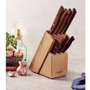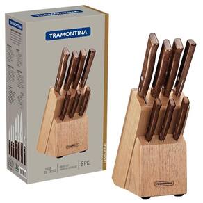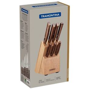 DESCRIÇÃO DO JOGO DE FACAS TRADICIONAL COM CABO DE MADEIRA NATURAL E SUPORTE - Com o jogo de facas Tramontina Tradicional com lâminas em aço inox e cabos em madeira natural com suporte 08 peças, você terá as facas mais especiais para o preparo das suas refeições. - Produzidas com lâminas em aço inox e cabos em madeira natural com rebites de alumínio, o que garante alto poder de corte, maior resistência e durabilidade. - Um jogo essencial para completar sua cozinha e deixá-la preparada para as receitas mais diversas!