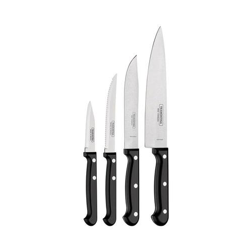 Jogo de Facas Tramontina Ultracorte com Lâminas em Aço Inox e Cabos de Polipropileno Preto 4 Peças Existem facas que são essenciais para o sucesso das nossas receitas. Com o Jogo de Facas Tramontina Ultracorte com Lâminas em Aço Inox e Cabos de Polipropileno Preto 4 Peças da Linha Ultracorte você vai encontrar talheres que se adaptam às diferentes funções na cozinha. As 4 peças possuem cabos em polipropileno na cor preta, confortável no manuseio e com proteção antimicrobiana, inibindo a ação de bactérias e fungos. As lâminas em aço inox são resistentes e possuem tratamento térmico, que dão maior durabilidade ao fio. Para facilitar ainda mais o dia-a-dia, as peças podem ser levadas à máquina de lavar louças. Informações Gerais As lâminas de aço inox têm maior durabilidade do fio devido ao tratamento térmico. Os cabos de polipropileno possuem maior resistência e durabilidade. E contam com proteção antimicrobiana, que inibe e reduz o crescimento de bactérias e fungos proporcionando benefícios em higiene e redução de microorganismos que causam contaminação. Esta ação dura por toda a vida útil dos produtos, mas não elimina a necessidade de limpeza. Rebites de alumínio. Podem ir à máquina de lavar louças facilitando seu dia a dia.
