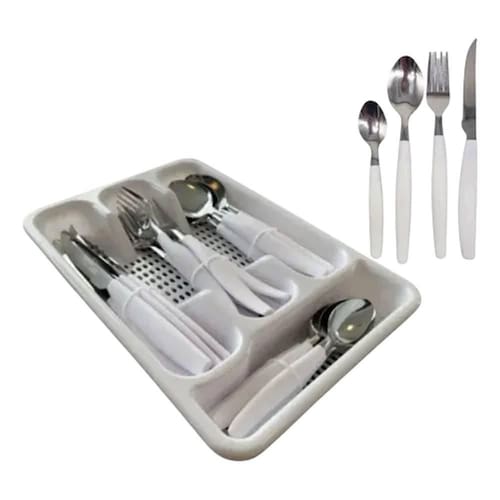 Especificações: - Material: Aço Inox e Plástico - Medida Colher de Mesa: 19cm x 04cm cada - Medida Colher Sobremesa: 15cm x 03cm cada - Medida Garfo: 20cm x 2,5cm cada - Medida Faca: 22cm x 1,5cm cada - Medida Porta Talher: 27cm x 18,5cm x 03cm - Cor: Branco ===================================== Devido à diferença entre monitores e iluminação diferentes, pode haver variação na tonalidade apresentada no anúncio. Medidas muito aproximadas. Marca: Não Informado