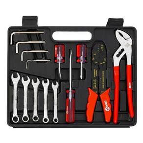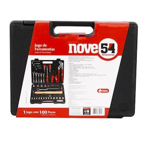 Jogo De Ferramentas Com 100 Peças E Maleta Nove54 - Kf 100 Indicado para manutenções e reparos em geral. Acompanha maleta plástica para perfeito acondicionamento das ferramentas e facilitar o transporte. 1 Jogo de ferramentas, composto por maleta plástica com 100 peças em aço carbono, sendo: 2 chaves de fenda 6 mm x 40 mm e 6 mm x 100 mm , 1 chave phillips 6 mm x 40 mm, 4 chaves allen 3 mm, 4 mm, 5 mm e 6 mm , 5 chaves combinadas 8 mm, 9 mm, 10 mm, 11 mm e 12 mm , 1 alicate multiuso, 1 alicate bomba d'água, 1 martelo pena 300 g, 1 miniarco de serra, 4 soquetes sextavados encaixe 3/8 14 mm, 15 mm, 16 mm e 17 mm , 13 soquetes sextavados encaixe 1/4 4 mm - 4,5 mm - 5 mm - 5,5 mm, 6 mm - 6,5 mm - 7 mm - 8 mm - 9 mm - 10 mm - 11 mm - 12 mm e 13 mm , 1 catraca, 1 chave T, 1 soquete adaptador, 11 ponteiras, 53 terminais elétricos diversos Quantidade de peças do jogo de ferramentas:100 peças CDC : legal: 90 dias