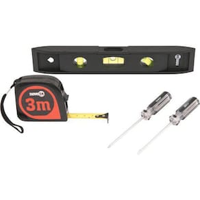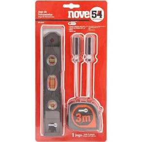 1 jogo de ferramentas com 4 peças, sendo: 1 nível plástico 9, 1 chave de fenda aço carbono 1/8 x 3, 1 chave de fenda cruzada/phillips aço carbono 1/8 x 3 e 1 trena 3 m
