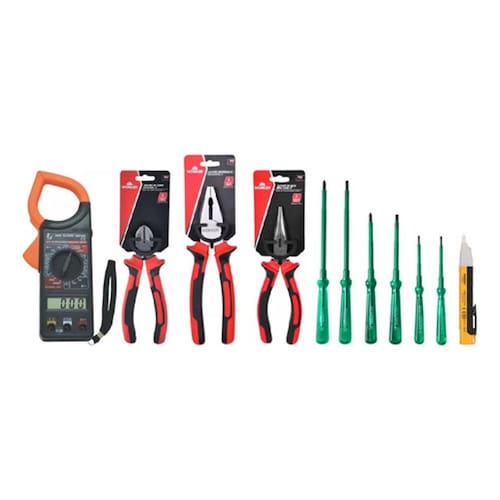 Jogo de ferramentas eletricista profissional, indicado para eletricistas, técnicos e engenheiros, contendo: alicate amperímetro, alicate universal, alicate de bico, alicate de corte e 01 conjunto de 06 chaves de fenda e phillips haste isolada ponta imantada, recomendação nr-10 e norma abnt- nbr 9699 .