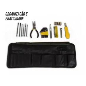 - Itens inclusos: 04 soquetes, 01 extensor, 08 chaves allen, 01 pinça, 01 chave encaixe sextavado 1/4, 01 mini alicate bico longo, 06 chaves de precisão, 10 bits