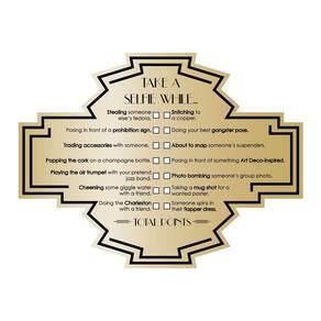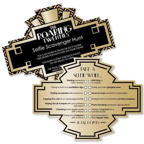 O jogo de festa Roaring 20's Selfie Scavenger Hunt INCLUI 12 cartas de jogo com instruções de selfie para jogar em equipe ou individualmente em seu baile de formatura ou festa de aniversário.