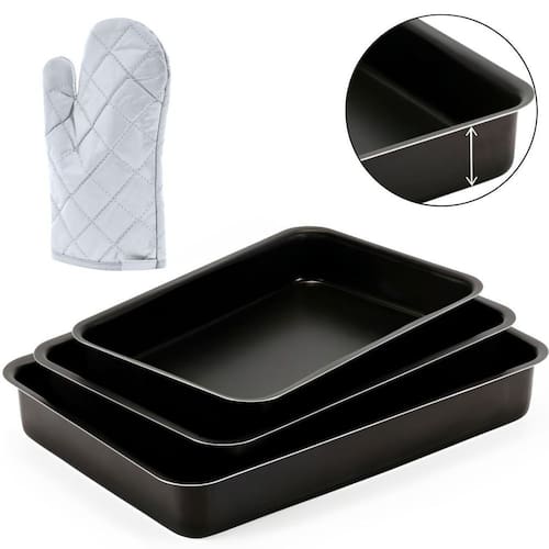 Jogo de assadeiras retangulares com revestimento antiaderente de alta qualidade, que impede que os alimentos grudem. Inclui três peças de diferentes tamanhos e uma luva térmica.Tipo