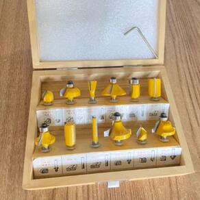 - 1x Fresa reta 6mm. - 1x Fresa para Rasgo um U 12,7mm (raio 6.35). - 1x Fresa para moldura arredondada com rolamento 22m (raio 6.35). - 1x Fresa rabo de andorinha 12.7mm (ângulo 14). - 1x Fresa para acabamento com rolamento 12,7mm. - 1x Fresa reta 16mm. - 1x Fresa quebra canto com rolamento 22mm (raio 6.35). - 1x Fresa reta 12mm. - 1x Fresa quebra canto com rolamento 28.6mm (raio 9.5). - 1x Fresa rasgo em V 12.7mm (Ângulo 90). - 1x Fresa moldura romana com rolamento 25.4mm (raio 4). - 1x Fresa chanfro 45º 32mm. - 1x Chave allen. - 1x Estojo.