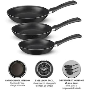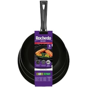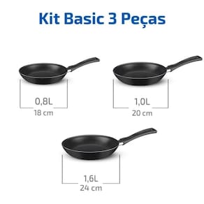 Jogo De Frigideiras 3 Peças Basic Antiaderente Preto Rochedo O Kit de Frigideiras Antiaderentes Rochedo Basic, com três peças de 18cm, 20cm e 24cm, é essencial para diversas ocasiões na cozinha. Feitas em alumínio com cabos de 14,8 cm, possuem antiaderente interno e externo, facilitando a limpeza e o preparo dos alimentos. Livres de PFOA e compatíveis com fogões a gás, vitrocerâmicos e elétricos exceto indução , garantem qualidade e segurança. Atributos do Produto: Referência: 5861033864 Código: 5861033864 Código de Barras: 7702073024497 Cor: Preto : 3 Meses Fabricante Marca: Rochedo Linha: Basic Material: Alumínio Detalhes e Especificações Técnicas: Livres de PFOA Cabo de 14,8 cm Peças de 18cm, 20cm e 24cm Antiaderente interno e externo Compatíveis com fogões a gás, vitrocerâmicos e elétricos exceto indução Dimensões da embalagem: Altura: 10,0 cm Largura: 24,0 cm Comprimento: 38,8 cm Peso: 1,18 Kg Conteúdo da Embalagem: 01 Frigideiras Antiaderente 1,6L Basic Preta Rochedo 24cm 01 Frigideiras Antiaderente 1,0L Basic Preta Rochedo 20cm 01 Frigideiras Antiaderente 0,8L Basic Preta Rochedo 18cm Importante Produtos de decoração não inclusos. Imagens meramente ilustrativas; As cores dos objetos podem sofrer alterações devido a luminosidade, configurações do monitor e até mesmo a percepção do usuário; Os dados divulgados são de responsabilidade do fabricante/fornecedor. Marca: Não Informado