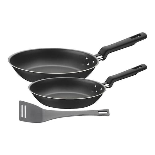 O Jogo de Frigideiras Tramontina Loreto em Alumínio com Revestimento Interno e Externo Antiaderente Starflon T1 com Cabos Baquelite Grafite 3 Peças é a escolha certa para sua cozinha! As duas frigideiras são produzidas em alumínio, que proporciona um cozimento rápido e uniforme dos alimentos, devido sua espessura. Seu revestimento interno e externo antiaderente Starflon T1 possui alto poder de antiaderência e ainda garante maior resistência à abrasão, prolongando sua vida útil em 5.000 ciclos. Para dar mais segurança no manuseio, os cabos são produzidos em baquelite antitérmico, que não esquenta e evita queimaduras. Além disso, acompanha uma espátula para lhe auxiliar nas mais diversas receitas. É um jogo essencial em sua cozinha, pois é resistente, durável e prático, podendo ir à máquina de lavar louças todos os dias. Garanta já o seu e tenha momentos inesquecíveis na cozinha!