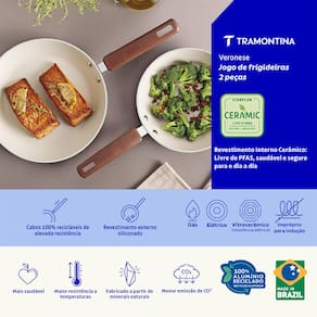 O Jogo de Frigideiras Veronese da Tramontina é a escolha definitiva para quem busca aliar alta performance gastronômica com responsabilidade ambiental. Com um design moderno na cor bege, este conjunto de 2 peças é fabricado em alumínio reciclado, garantindo um aquecimento rápido e uniforme para preparos mais precisos e equilibrados.