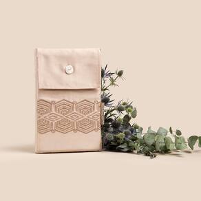 Juntamente com o jogo de fronha, temos sua embalagem, produzida com o mesmo material e com acabamentos exatamente iguais ao jogo de fronha. Seu fechamento é com botões de Madrepérola - uma substância rica em calcário que é extraída da parte interna das conchas da praia. Este material é 100% natural e possui aspecto perolizado, tornando a embalagem ainda mais nobre.