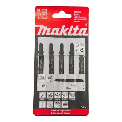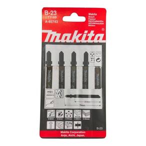 Jogo De Laminas De Serra Tico-tico Para Metais B23 Makita A-85743 Jogo de Laminas de Serra Tico-Tico para Metais B23 Makita A-85743 - CARTELA COM 05 PEÇAS Características Gerais do Produto: - Modelo: A-85743 - Marca: Makita - Material: HSS - Características: Compatível para os modelos Makita DJV181, DJV182, DJV141, DJV142, DJV180, DJV140, JV183D, JV143D, JV0600, JV100D, JV101D, JV102D, JV103D, DJR185, DJR145, JR102D, JR105D, 4326, 4327, 4328, 4329, 4350T/CT/FCT, 4351T/CT/FCT e demais modelos de outras marcas. - Ideal Para: Cortes em madeiras laminadas e chapas de metal de espessura média Garantia: - 03 meses de garantia direto com o fabricante