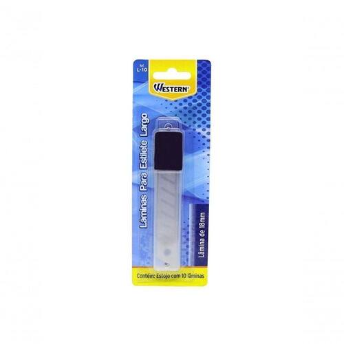 Lâminas para estilete, caso a sua já estiver velha, sem corte, enferrujada. Fique prevenido e prático, para o momento de uso. - Características:Lâmina de 18mm *Imagens meramente ilustrativas. Dimensões da Peça: 11,5 x 2,5 x 1cmEstojo: 12 x 2,2 x 0,9cmLâminas: 10,6 x 1,8cmDimensões da Embalagem:6 x 1,1 x 18,5cm Quantidade Inner:120 PeçasDimensões Inner:33 x 20 x 16cm Quantidade Master: 480 PeçasDimensões Master: 41 x 34 x 35cm Material: Aço carbono, PP Cor: Prata Tipo de Embalagem: Blister Marca: Western Espessura:0,2mm Contém: Estojo com10 lâminas