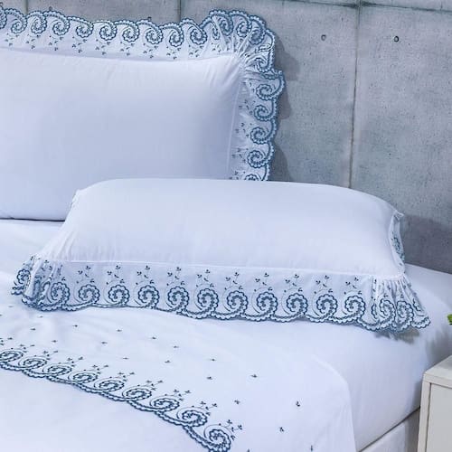 Detalhes Ricamente Bordados: A vira do lençol de cima e as abas das fronhas possuem um lindo e detalhado bordado, que confere um visual luxuoso e de alta decoração à sua cama.