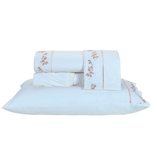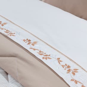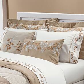 1 Lençol de cima: Com bordado de folhagens, proporciona um toque de elegância e sofisticação à sua cama. 1 Lençol com elástico (slip): Garante um ajuste perfeito ao colchão e facilita a arrumação da cama. 2 Fronhas com abas: Com o mesmo bordado delicado do lençol de cima, complementam o conjunto com perfeição.