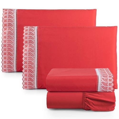 Jogo De Lençol Casal 4 Peças Basic Percal 180 Fios Lese Bordado Inglês - Vermelho