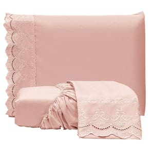 Jogo De Lençol Casal Padrão Bordado Ingles Micropercal 300 Fios Toque De Algodão 3 Peças - Rose - Rosa