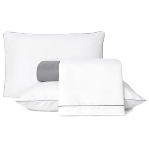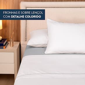 O kit conta com fronha e sobre lençol na cor branca. A fronha possui fechamento em envelope, o que facilita a retirada para lavagem. O jogo também acompanha um lençol com elástico nas 04 laterais.