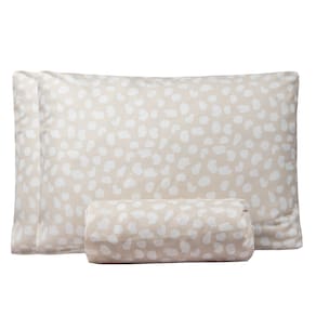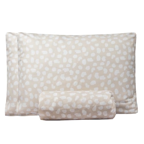O conjunto também inclui duas fronhas com estampa, cada uma medindo 0,5 metros de largura por 0,7 metros de comprimento.