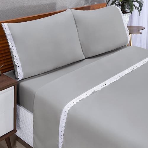 Jg De Lençol Casal Queen Microfibra com Lese 04 Peças - Cinza CONTÉM: 01 Lençol com elástico 2,10 X 1,58 X 3001 Lençol de cima sem elástico com detalhe em Lese 2,50 X 2,4002 Fronhas com detalhe em Lese 70 x 50 COMPOSIÇÃO:Tecido Microfibra 100% Poliéster ORIENTAÇÕES DE CUIDADOS:-não utilizar produtos alvejantes base de cloro água sanitária, água de lavadeira, entre outros ;-faça enxágue final abundante para retirar todo o excesso de sabão e amaciante, evitando que a peça fique esbranquiçada;-tons críticos e cores fortes desbotam com mais facilidade evite exposição prolongada ao sol ;-colocar sal no último enxágue em peças escuras evita que solte tinta e manche .