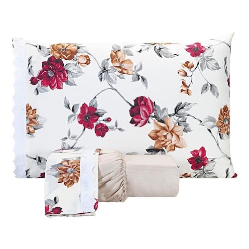 Jogo De Lençol Estampado Solteiro 02 Peças Flores Palha CONTÉM: 01 Lençol com elástico 1,88 X 90 X 3001 Fronha com detalhe em Lese 70 x 50 COMPOSIÇÃO: LENÇOL Tecido Microfibra 100% PoliésterFRONHAS Tecido Algodão 160 fios ORIENTAÇÕES DE CUIDADOS:-não utilizar produtos alvejantes a base de cloro água sanitária, água de lavadeira, entre outros ;-faça enxágue final abundante para retirar todo o excesso de sabão e amaciante, evitando que a peça fique esbranquiçada;-tons críticos e cores fortes desbotam com mais facilidade evite exposição prolongada ao sol ;-colocar sal no último enxágue em peças escuras evita que solte tinta e manche